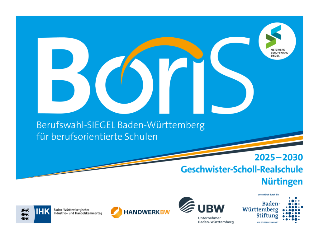 Die Geschwister-Scholl-Realschule Nürtingen hat sich in diesem Bereich in den letzten Jahren als starke und zuverlässige Begleitung etabliert und unterstützt die Schülerinnen und Schülern bei der Auswahl des passenden Berufes.  Mit der Verleihung des BoriS Berufswahl Siegels erhielt die GSR in diesem Jahr zum ersten Mal die begehrte Auszeichnung des Landes Baden-Württemberg und damit die Bestätigung für die hervorragende Arbeit im Bereich ‚Berufliche Orientierung‘.